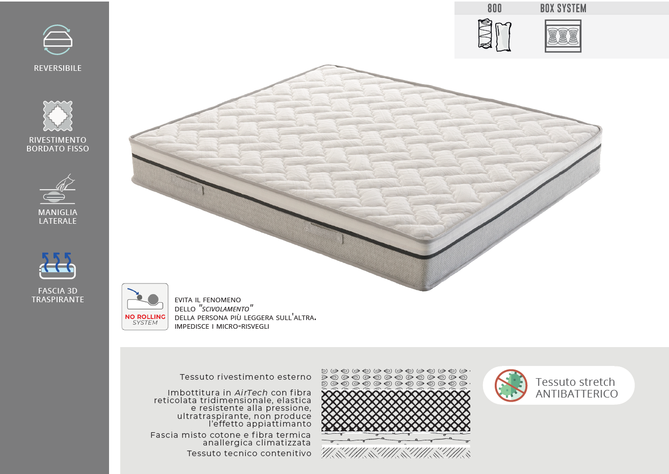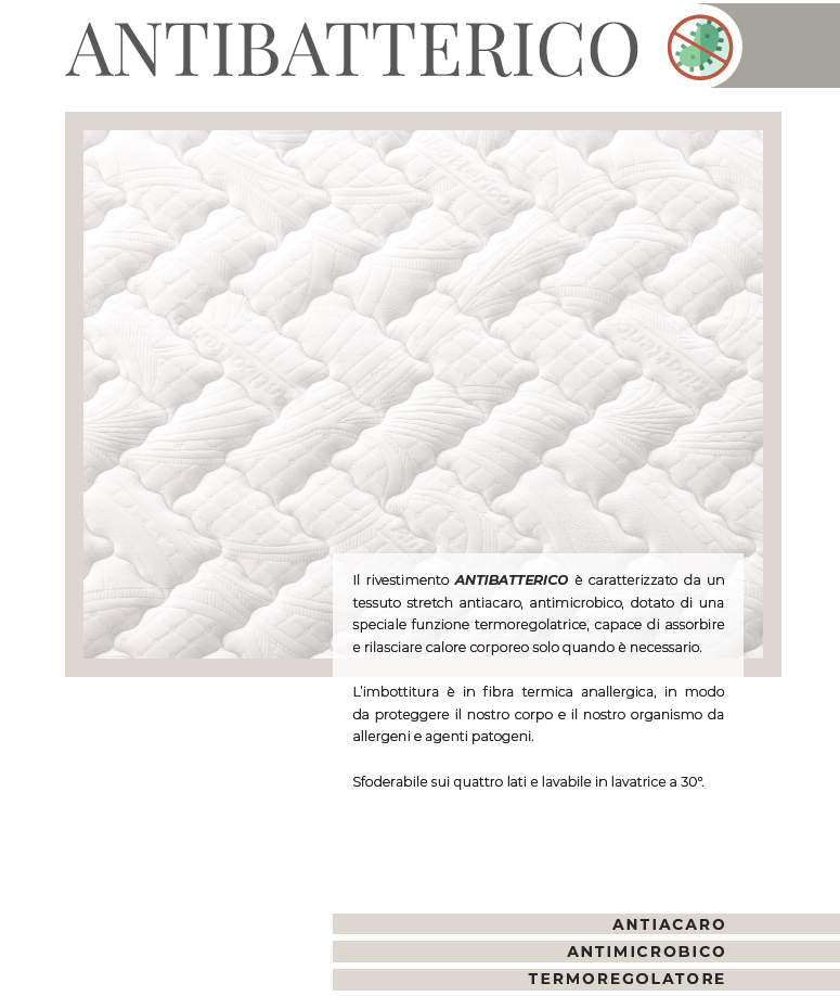 Il rivestimento è realizzato in tessuto stretch antibatterico e antiacaro. Inoltre, svolge una funzione termoregolatrice.