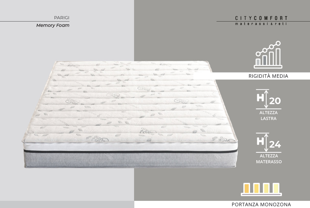 Il materasso memory foam ortopedico Parigi offre supporto ergonomico e comfort elevato. Inoltre, garantisce alta traspirabilità grazie alla tecnologia AirTech.